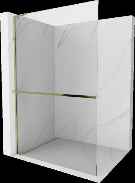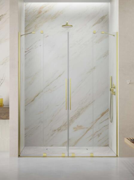 Alsógörgős zuhanyajtó dupla tolóajtóval, oldal fix üvegrészekkel, szálcsiszolt arany kivitel. |Méret: 200 cm|Magasság: 200 cm|Profil színe: szálcsiszolt arany|Üveg: átlátszó|8 mm vastag, Easy Clean vízlepergető bevonattal ellátott edzett üveggel gyártjuk, mely elsőrendű megoldás a vízkőfoltok ellen, valamint a lerakódások megakadályozására. |Felső stabilizáló ele