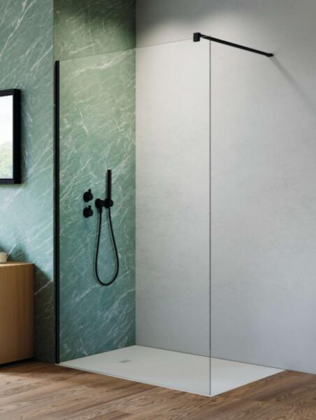 Kellően szabad teret biztosít a zuhanyzáshoz. 8 mm vastag Easy Clean vízlepergető bevonattal ellátott edzett üvegből gyártjuk, mely elsőrendű megoldás vízkőfoltok, lerakódások megakadályozására. Igény esetén, egyedi méretben is elkészítjük Önnek! A konstrukció stabilitását az elegáns fekete rögzítő elemek biztosítják. A távtartó rúd mozgatható feje lehetővé