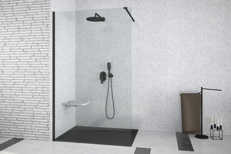 Besco Aveo Black Walk in zuhanyfal fekete profillal, 110x195 cm Betét: átlátszó, 8 mm edzett, biztonsági üveg Profilok: matt fekete Fali kitámasztó hossza max. 1200 mm, vágható igény szerint Univerzális - JOBBOS/BALOS kivitel Állítható profilok falhoz rögzítésénél Magasság: 1950 mm Európai termék 6 méretben készül A képen a zuhanytálca dekorációs célt szolgál, az á