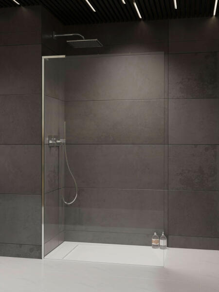 Panoráma a fürdőszobára. Zuhanykabin minimalista stílussal. Szinte észre sem veszi, és tágasabbá teszi a fürdőszobát. 8 mm vastag Easy Clean vízlepergető bevonattal ellátott edzett üvegből gyártjuk, mely elsőrendű megoldás vízkőfoltok, lerakódások megakadályozására. Az állítható takaróprofil lehetővé teszi a fal függőleges eltéréseinek kiigazítását. Zuhanyt