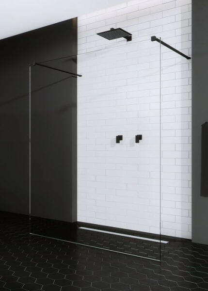 Kellő szabad teret biztosít a zuhanyzáshoz. 8 mm vastag Easy Clean vízlepergető bevonattal ellátott edzett üvegből gyártjuk, mely elsőrendű megoldás vízkőfoltok, lerakódások megakadályozására. Igény esetén, egyedi méretben is elkészítjük Önnek! A konstrukció stabilitását az elegáns fekete rögzítő elemek biztosítják. A távtartó rúd mozgatható feje lehetővé t
