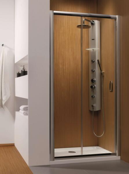 Görgős tolóajtó fix résszel. |Méret: 115 cm|Magasság: 190 cm|Profil színe: króm|Üveg: átlátszó|5 mm vastag, Easy Clean vízlepergető bevonattal ellátott edzett üveggel gyártjuk, mely elsőrendű megoldás a vízkőfoltok ellen, valamint a lerakódások megakadályozására. |Az állítható króm takaróprofil lehetővé teszi a fal függőleges eltérésének kiigazítását. |Du