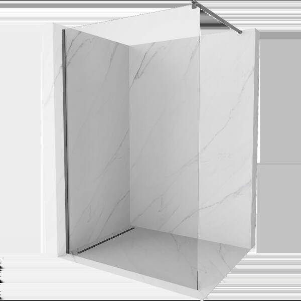 Fali profillal a falra szerelhető szálcsiszolt fegyvermetál pengefal 8 mm-es Easy Clean edzett üvegből. |Méret: 90 cm|Magasság: 200 cm|Profil színe: szálcsiszolt fegyvermetál|Üveg: átlátszó|8 mm vastag Easy Clean vízlepergető bevonattal ellátott edzett üvegből gyártjuk, mely elsőrendű megoldás vízkőfoltok, lerakódások megakadályozására. |Az állítható takaróprofil