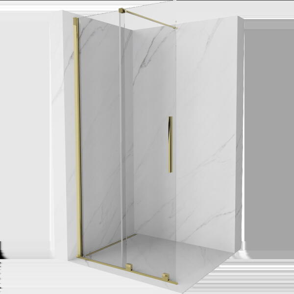 Szálcsiszolt arany kádparaván görgős ajtóval és egy fix résszel. |Méret: 180 cm|Magasság: 150 cm|Profil színe: szálcsiszolt arany|Üveg: átlátszó|Jobbos kivitel|8 mm vastag, Easy Clean vízlepergető bevonattal ellátott edzett üveggel gyártjuk, mely elsőrendű megoldás a vízkőfoltok ellen, valamint a lerakódások megakadályozására. |Felső stabilizáló elem, innovatív l