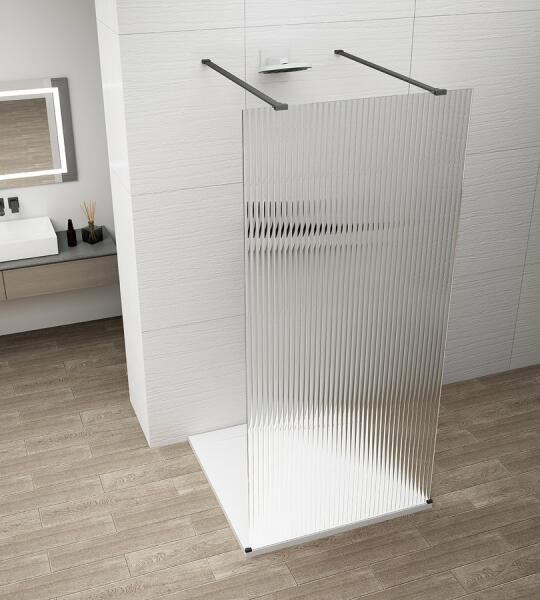 Walk-in zuhanyfal|Magasság: 210 cm|Szélesség: 100 cm|Forma: fix walk|Üveg típusa: flute üveg|Üvegbevonat: antidrop|Üveg vastagság: 8 mm|Az ár 2 darab Esca merőleges, matt fekete színű merevítőt tartalmaz! (mérete: 120 cm)|A kép illusztráció!