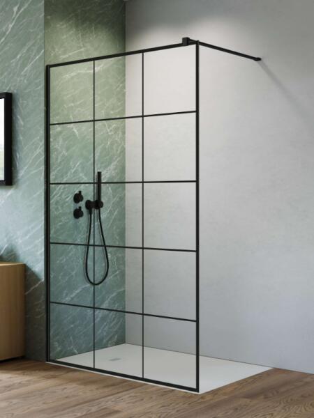 Fali profillal a falra szerelhető fekete pengefal 6 mm-es Easy Clean edzett üvegből, Factory mintával. |Méret: 80 cm|Magasság: 200 cm|Profil színe: fekete|Üveg: átlátszó|6 mm vastag Easy Clean vízlepergető bevonattal ellátott edzett üvegből gyártjuk, mely elsőrendű megoldás vízkőfoltok, lerakódások megakadályozására. |Nagy stabilitást biztosító tartórúd. |Elegáns,