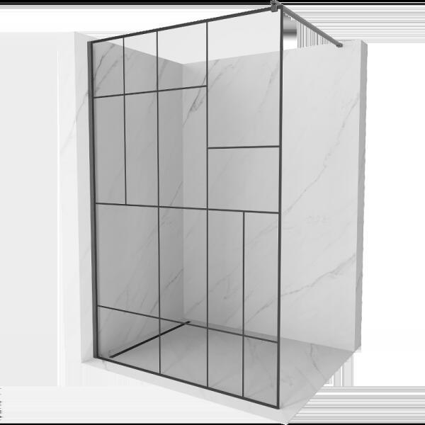 Fali profillal a falra szerelhető fekete pengefal 8 mm-es Easy Clean edzett üvegből, Frame mintával. |Méret: 110 cm|Magasság: 200 cm|Profil színe: fekete|Üveg: átlátszó|Különösen figyelemre méltó megoldás a Factory és Frame elnevezésű időtálló díszítés, amely kerámiafestékkel díszített rácsháló mintával rendelkezik, és a hőkezeléskor egy egységként szilárdul