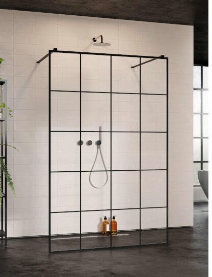 Panoráma a fürdőszobára. Zuhanykabin minimalista stílussal. Szinte észre sem veszi, és tágasabbá teszi a fürdőszobát. Különösen figyelemre méltó megoldás a Factory és Frame elnevezésű időtálló díszítés, amely kerámiafestékkel díszített rácsháló mintával rendelkezik, és a hőkezeléskor egy egységként szilárdul meg az edzett üveggel. Ezt a különleges techno