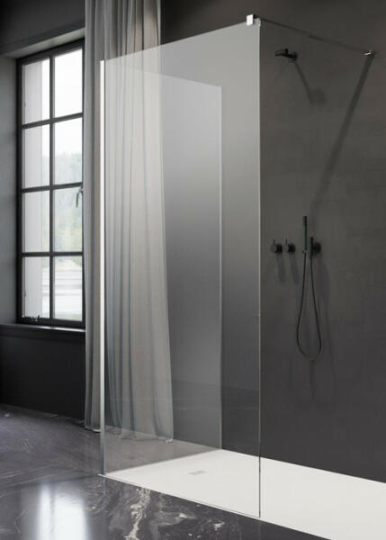 Kellően szabad teret biztosít a zuhanyzáshoz. 8 mm vastag Easy Clean vízlepergető bevonattal ellátott edzett üvegből gyártjuk, mely elsőrendű megoldás vízkőfoltok, lerakódások megakadályozására. Igény esetén, egyedi méretben is elkészítjük Önnek! A konstrukció stabilitását az elegáns króm rögzítő elemek biztosítják. A távtartó rúd mozgatható feje lehetővé