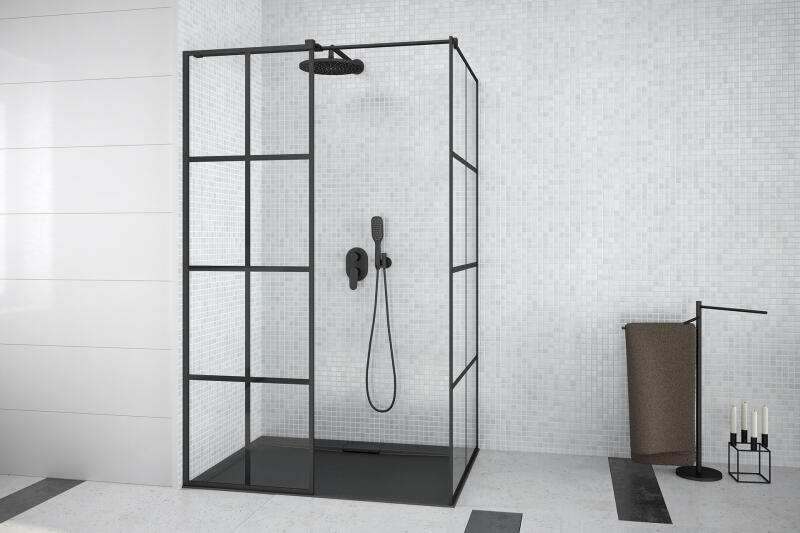 Besco Excea 2 részes Walk in zuhanyfal, fekete profillal, 120x80x190 cm Betét: átlátszó, 8 mm edzett, biztonsági üveg Profilok: matt fekete Fali kitámasztó hossza max. 1200 mm, vágható igény szerint Univerzális - JOBBOS/BALOS kivitel Állítható profilok falhoz rögzítésénél Magasság: 1900 mm Európai termék 4 méretben készül A képen a zuhanytálca dekorációs célt szolg