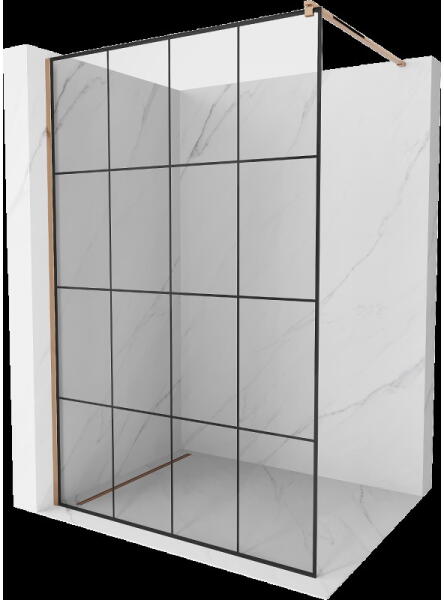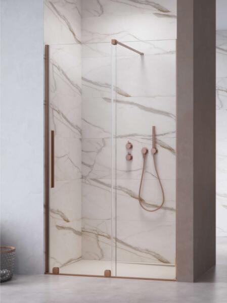 Alsógörgős zuhanyajtó egy fix résszel, szálcsiszolt réz kivitel. |Méret: 130 cm|Magasság: 200 cm|Profil színe: szálcsiszolt réz|Üveg: átlátszó|Balos kivitel|8 mm vastag, Easy Clean vízlepergető bevonattal ellátott edzett üveggel gyártjuk, mely elsőrendű megoldás a vízkőfoltok ellen, valamint a lerakódások megakadályozására. |Felső stabilizáló elem, innovatív lass