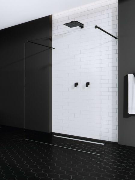 Fekete pengefal 10 mm-es Easy Clean edzett üvegből. |Méret: 140 cm|Magasság: 200 cm|Profil színe: fekete|Üveg: átlátszó|10 mm vastag Easy Clean vízlepergető bevonattal ellátott edzett üvegből gyártjuk, mely elsőrendű megoldás vízkőfoltok, lerakódások megakadályozására. |Az állítható takaróprofil lehetővé teszi a fal függőleges eltéréseinek kiigazítását. |Szil
