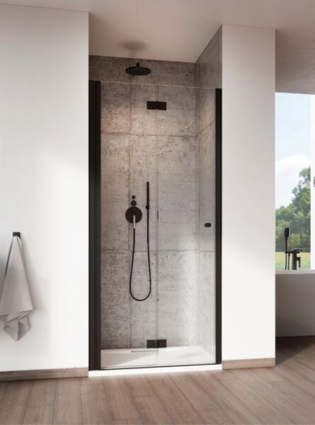 Csuklós kivitelű fekete zuhanyajtó maximális belépőszélességgel. |Méret: 80 cm|Magasság: 200 cm|Profil színe: fekete|Üveg: átlátszó|Balos kivitel|6 mm vastag, Easy Clean vízlepergető bevonattal ellátott edzett üveggel gyártjuk, mely elsőrendű megoldás a vízkőfoltok ellen, valamint a lerakódások megakadályozására. |Elegáns, praktikus elemek. |Precíz vízzárást bizt