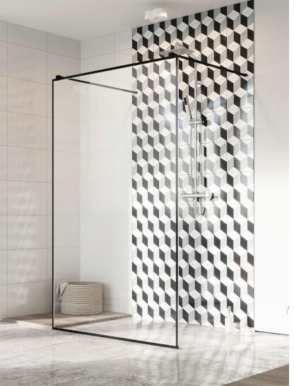 Fali profillal a falra szerelhető fekete pengefal 8 mm-es Easy Clean edzett üvegből, Factory mintával. |Méret: 85 cm|Magasság: 200 cm|Profil színe: fekete|Üveg: átlátszó|Különösen figyelemre méltó megoldás a Factory és Frame elnevezésű időtálló díszítés, amely kerámiafestékkel díszített rácsháló mintával rendelkezik, és a hőkezeléskor egy egységként szilárdu