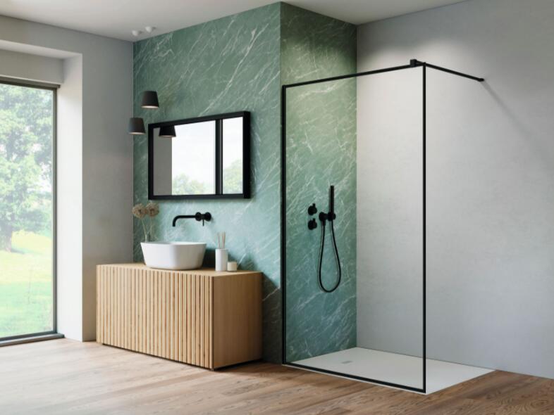 Fali profillal a falra szerelhető fekete pengefal 6 mm-es Easy Clean edzett üvegből, Frame mintával. |Méret: 110 cm|Magasság: 200 cm|Profil színe: fekete|Üveg: átlátszó|6 mm vastag Easy Clean vízlepergető bevonattal ellátott edzett üvegből gyártjuk, mely elsőrendű megoldás vízkőfoltok, lerakódások megakadályozására. |Nagy stabilitást biztosító tartórúd. |Elegáns, p