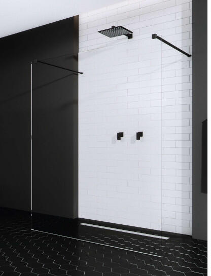 Fali profillal a falra szerelhető fekete pengefal 10 mm-es Easy Clean edzett üvegből, akár 300 cm-es magassággal. |Méret: 30-100 cm|Magasság: 200-250 cm|Profil színe: fekete|Üveg: átlátszó|10 mm vastag Easy Clean vízlepergető bevonattal ellátott edzett üvegből gyártjuk, mely elsőrendű megoldás vízkőfoltok, lerakódások megakadályozására. |Az állítható takaróprofil le