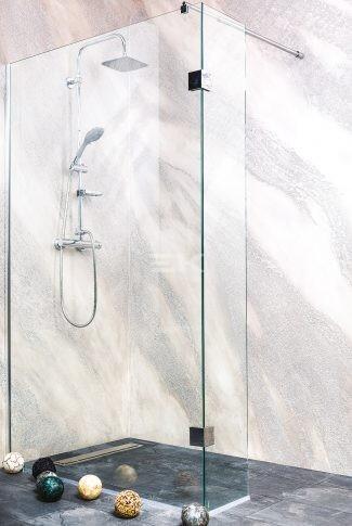 Panoráma a fürdőszobára. Zuhanykabin minimalista stílussal. Szinte észre sem veszi, és tágasabbá teszi a fürdőszobát. 8 mm vastag Easy Clean vízlepergető bevonattal ellátott edzett üvegből gyártjuk, mely elsőrendű megoldás vízkőfoltok, lerakódások megakadályozására. Az állítható takaróprofil lehetővé teszi a fal függőleges eltéréseinek kiigazítását. Zuhanyt