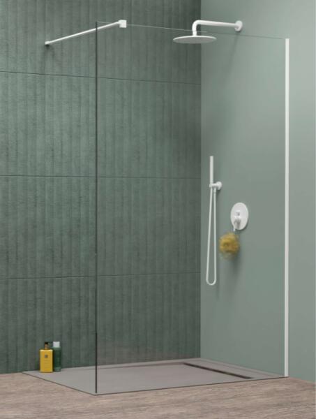 Fali profillal a falra szerelhető fehér pengefal 8 mm-es Easy Clean edzett üvegből. |Méret: 85 cm|Magasság: 200 cm|Profil színe: fehér|Üveg: átlátszó|8 mm vastag Easy Clean vízlepergető bevonattal ellátott edzett üvegből gyártjuk, mely elsőrendű megoldás vízkőfoltok, lerakódások megakadályozására. |Az állítható takaróprofil lehetővé teszi a fal függőleges eltér
