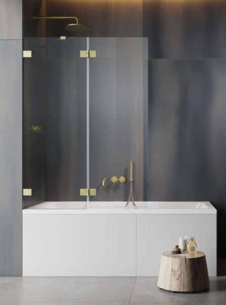 Csuklós/lengőajtós kivitelű szálcsiszolt arany kádparaván egy fix résszel. |Méret: 100 cm|Magasság: 150 cm|Profil színe: szálcsiszolt arany|Üveg: átlátszó|Jobbos kivitel|6 mm vastag, Easy Clean vízlepergető bevonattal ellátott edzett üveggel gyártjuk, mely elsőrendű megoldás a vízkőfoltok ellen, valamint a lerakódások megakadályozására. |Nagy stabilitást biztosító