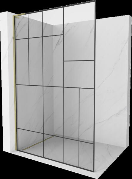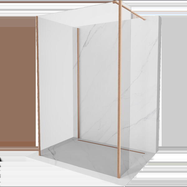 Fali profillal a falra szerelhető arany pengefal 6 mm-es Easy Clean edzett üvegből. |Méret: 65 cm|Magasság: 200 cm|Profil színe: arany|Üveg: átlátszó|6 mm vastag Easy Clean vízlepergető bevonattal ellátott edzett üveggel gyártjuk, mely elsőrendű megoldás vízkőfoltok, lerakódások megakadályozására. |Nagy stabilitást biztosító tartórúd. |Állítható takaróprofil, mely