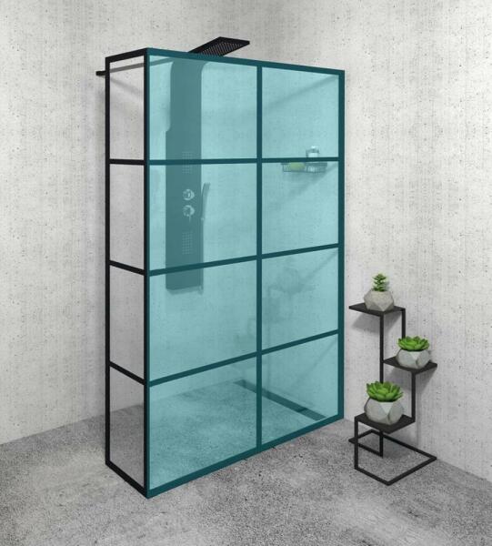 Panoráma a fürdőszobára. Zuhanykabin minimalista stílussal. Szinte észre sem veszi, és tágasabbá teszi a fürdőszobát. Különösen figyelemre méltó megoldás a Factory és Frame elnevezésű időtálló díszítés, amely kerámiafestékkel díszített rácsháló mintával rendelkezik, és a hőkezeléskor egy egységként szilárdul meg az edzett üveggel. Ezt a különleges techno