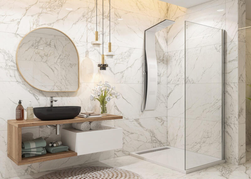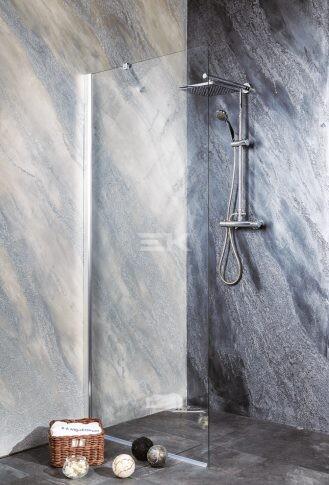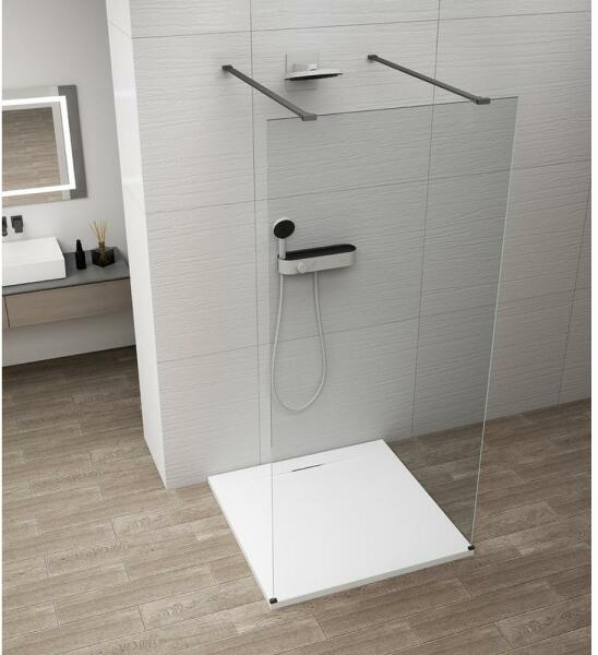 Panoráma a fürdőszobára. Zuhanykabin minimalista stílussal. Szinte észre sem veszi, és tágasabbá teszi a fürdőszobát. 8 mm vastag Easy Clean vízlepergető bevonattal ellátott edzett üvegből gyártjuk, mely elsőrendű megoldás vízkőfoltok, lerakódások megakadályozására. Az állítható takaróprofil lehetővé teszi a fal függőleges eltéréseinek kiigazítását. Zuhanyt