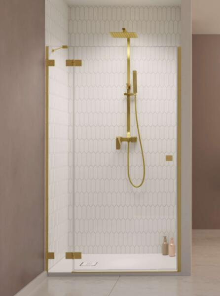Kifelé nyíló zuhanyajtó fix résszel, szálcsiszolt arany kivitel. |Méret: 110 cm|Magasság: 200 cm|Profil színe: szálcsiszolt arany|Üveg: átlátszó|Jobbos kivitel|6 mm vastag, Easy Clean vízlepergető bevonattal ellátott edzett üveggel gyártjuk, mely elsőrendű megoldás a vízkőfoltok ellen, valamint a lerakódások megakadályozására. |Elegáns, praktikus fogantyú. |Nagy stab