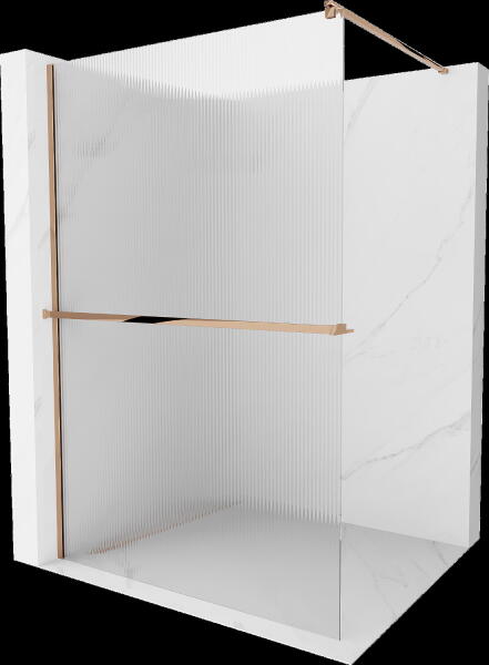 Gyártó: Mexen Sorozat: Kyoto Típus: zuhanykabin paraván Műszaki adatok: Szélesség: 140 cm Magasság: 200 cm Rögzítés: Univerzális (bal vagy jobb) Üveg színe: csíkos (minta: bordák) Profil színe: Rose gold Üveg típusa: Edzett Üvegvastagság: 8mm Profil anyaga: alumínium Stabilizáló merevítő: Rozsdamentes acél Stabilizáló rugóstag hossza: 150 cm (vágással rövidíthető