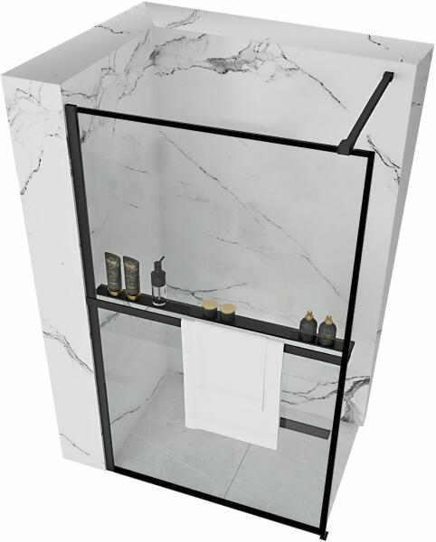 Mexen Kioto +, zuhany paraván polccal és törölközőtartóval 90 x 200 cm, 8mm üveg átlátszó üvegmintás fekete, fekete profil, 800-090-121-70-77 A zuhanykabin univerzális és népszerű megoldás minden fürdőszobába. A paraván ajtó nélküli, és egy rudat tartalmaz, amellyel a függöny felakasztható. A Kioto sorozat képernyője 8 mm-es edzett biztonsági üvegből készül, 200