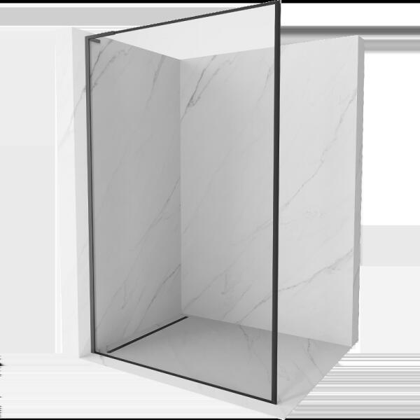Fali profillal a falra szerelhető fekete pengefal 8 mm-es Easy Clean edzett üvegből. |Méret: 130x75 cm|Magasság: 200 cm|Profil színe: fekete|Üveg: átlátszó|8 mm vastag Easy Clean vízlepergető bevonattal ellátott edzett üvegből gyártjuk, mely elsőrendű megoldás vízkőfoltok, lerakódások megakadályozására. |Az állítható takaróprofil lehetővé teszi a fal függőleges el