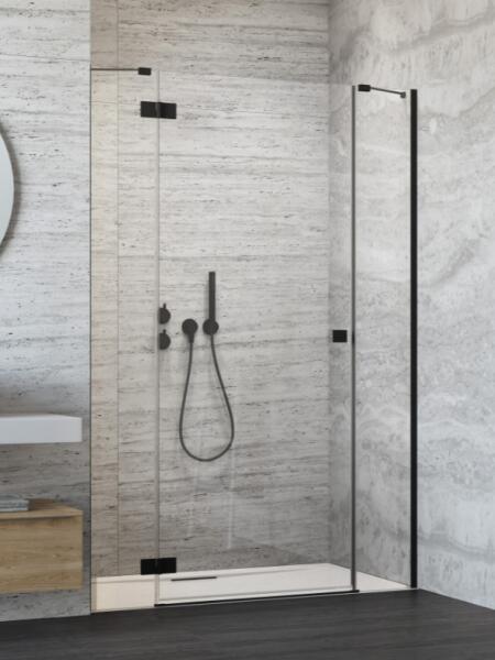 Kifelé nyíló fekete zuhanyajtó két oldalt fix résszel. |Méret: 110 cm|Magasság: 200 cm|Profil színe: fekete|Jobbos kivitel|Üveg: átlátszó|6 mm vastag, Easy Clean vízlepergető bevonattal ellátott edzett üveggel gyártjuk, mely elsőrendű megoldás a vízkőfoltok ellen, valamint a lerakódások megakadályozására. |Elegáns, praktikus fekete fogantyú. |Minimalista, letisztult f