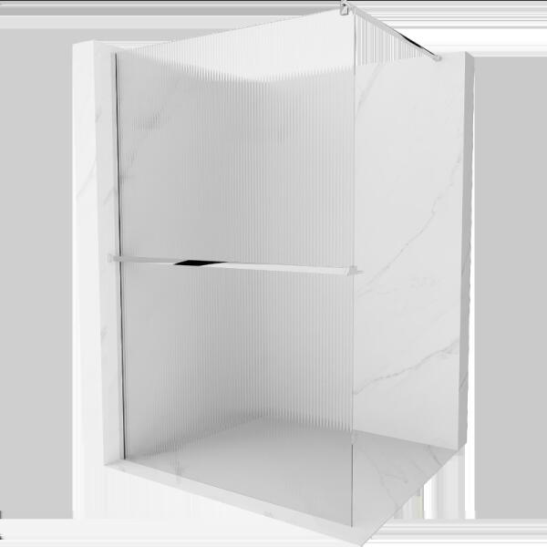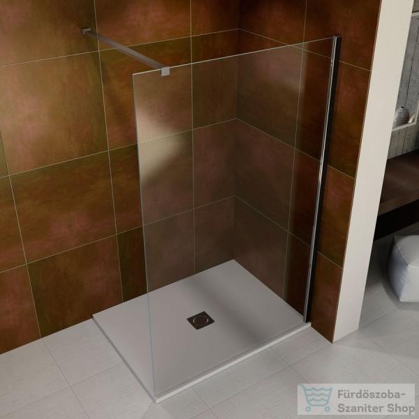 Radaway Modo New II 85 Walk-in zuhanyfal, átlátszó üveggel, króm profillal Magasság: 2 m 8 mm vastag Easy Clean vízlepergető bevonattal ellátott edzett üvegből , mely elsőrendű megoldás vízkőfoltok, lerakódások megakadályozására. A konstrukció stabilitását az elegáns króm rögzítő elemek biztosítják A távtartó rúd mozgatható feje lehetővé teszi a felszerelést a
