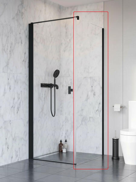 Walk-in zuhanyfal|Magasság: 210 cm|Mélység: 110 cm|Forma: fix oldalfal|Üveg típusa: transparent|Üvegbevonat: antidrop|Üveg vastagság: 8 mm|Profil színe: Fekete matt (az ár tartalmazza a fali profilt)|Az ár a merevítőt nem tartalmazza, külön szüskéges megvásárolni!|A kép illusztráció!