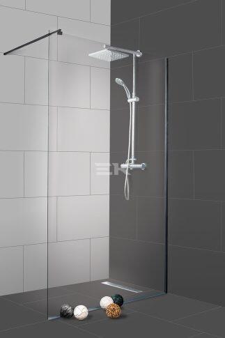 Profillal a falra szerelhető fix pengefal alsógörgős üvegrésszel, fekete kivitel. | 8 mm vastag EasyClean vízlepergető bevonattal ellátott edzett üveggel gyártjuk, mely elsőrendű megoldás vízkőfoltok, lerakódások megakadályozására. | Felső stabilizáló elem, innovatív lassító betéttel. | Zökkenőmentes görgő-rendszer. | Speciális fali takaró profil 10 mm-es toleranc