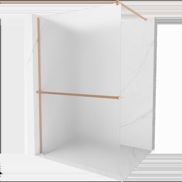 Profillal a falra szerelhető fix pengefal alsógörgős üvegrésszel, szálcsiszolt réz kivitel. |Méret: 150 cm|Magasság: 200 cm|Profil színe: szálcsiszolt réz|Üveg: átlátszó|Jobbos kivitel|8 mm vastag EasyClean vízlepergető bevonattal ellátott edzett üveggel gyártjuk, mely elsőrendű megoldás vízkőfoltok, lerakódások megakadályozására. |Felső stabilizáló elem, innovat