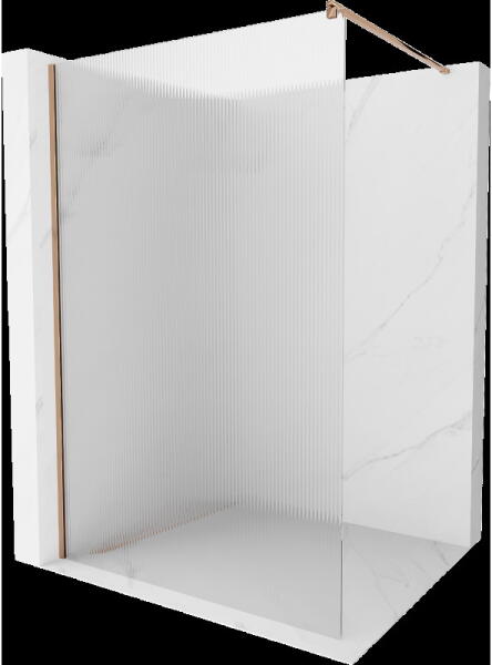 Fali profillal a falra szerelhető szálcsiszolt réz pengefal 8 mm-es Easy Clean edzett üvegből. |Méret: 95 cm|Magasság: 200 cm|Profil színe: szálcsiszolt réz|Üveg: átlátszó|8 mm vastag Easy Clean vízlepergető bevonattal ellátott edzett üvegből gyártjuk, mely elsőrendű megoldás vízkőfoltok, lerakódások megakadályozására. |Az állítható takaróprofil lehetővé teszi a