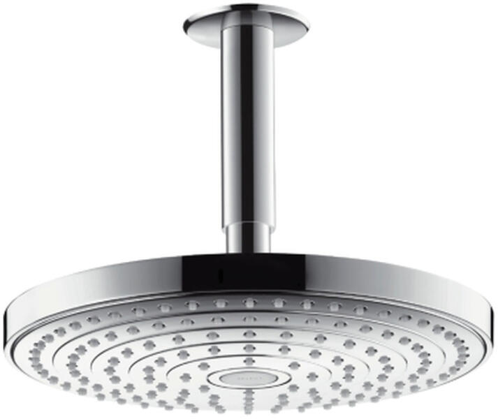 Hansgrohe Raindance Select S, fejzuhany 240 2jet EcoSmart 9 l/perc mennyezeti befúvással, króm, HAN-26469000 Termékleírás és paraméterek Tartalma: fejzuhany, mennyezeti bemenet Zuhanyfej mérete: Ø 240 mm Az adatfolyam típusa: RainAir, Rain Váltás a felső zuhanyzó Select gombjával Golyócsukló: a felső zuhany állítható dőlésszöge Vízsugár tárcsa anyaga: fém A vízsugár