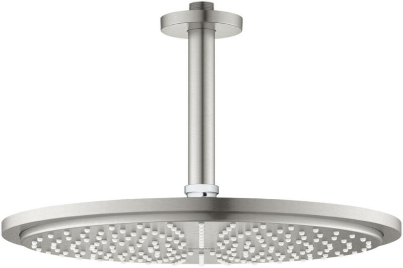 Grohe Rainshower Cosmopolitan 310 mennyezeti fejzuhany, 1 funkciós, zuhanykarral, rozsdamentes acél hatású 26067DC0 Garancia: 5 év 1 permetezési mód: Rain (egyenletes minta, lágy permet) Fejzuh any átmérője: 310 mm Zuhanykar hossza: 142 mm GROHE Water Saving 9.5 liter/perc vízmennyiség szabályozással Minimális kifolyási nyomás: 1,0 bar GROHE DreamSpray tökéletes zuhanysugárral