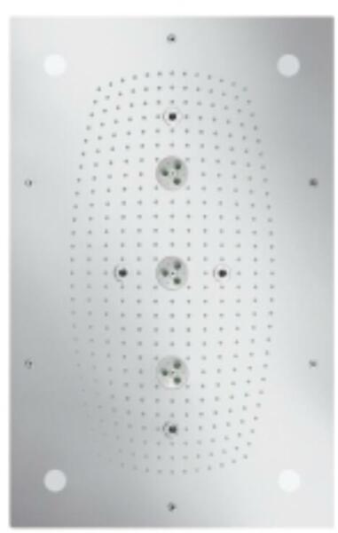 Termékjellemzők tartalmazza a következőket: fejzuhany, fali kiállás zuhanyfej mérete: 360 mm vízsugár fajta: PowderRain, Intense PowderRain, RainStream kinyúlás 381 mm középső vízsugártárcsa: 205 mm Keret: fém vízsugártárcsa anyaga: alumínium vízsugártárcsa színe: grafitszürke 10-30°-ban függőlegesen hajlítható zuhanyfej maximális átfolyási mennyiség 3 bar melle