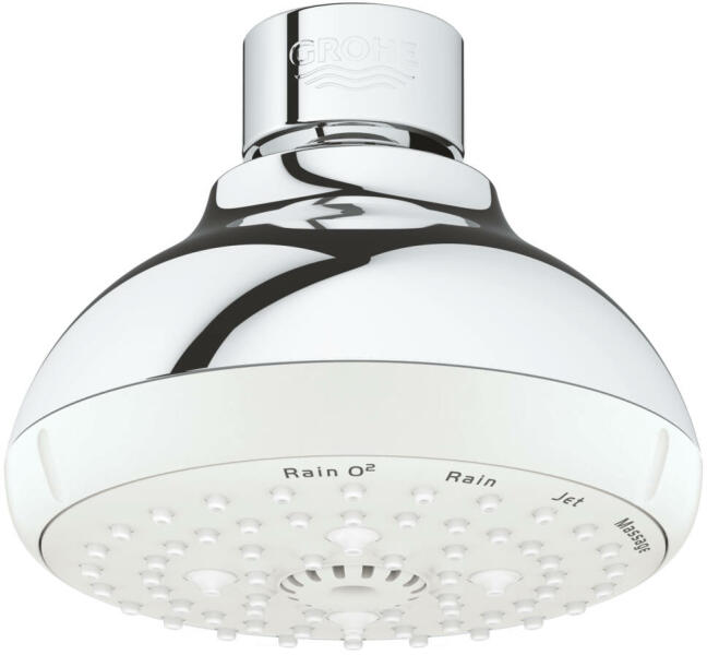 GROHE Rain O2, Rain, Massage, Jet funkciókkal gömbcsukló +/- 15°-os állíthatósággal csatlakozó menet 1/2" GROHE EcoJoy 6,6 liter/perc átfolyás-szabályozás GROHE DreamSpray tökéletes zuhanysugár GROHE StarLight króm felület SpeedClean vízkőmentesíthető fúvókákkal Inner WaterGuide belső vízvezető cső a hoszabb élettartam érdekében átfolyós vízmelegítővel is alkal