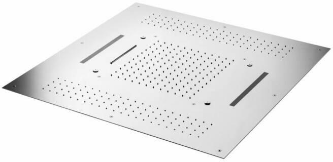 Teka SPA mennyezetbe építhető, nagyméretű, színterápiás, LED-es fejzuhany. Elegáns szögletes megjelenés, multifunkciós kivitel. Termék leírása Rozsdamentes acél AISI 304 4 funkció LED világítás Méret: 950 x 950 mm Vízálló távirányító a fények szabályozásához Vízkőmentes