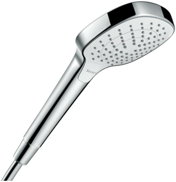 Hansgrohe Croma Select E, kézizuhany Vario EcoSmart 9 l/perc, fehér/króm, HAN-26813400 Termékleírás és paraméterek Zuhanyfej mérete: Ø 110 mm Áramlat típusa: Rain, TurboRain, IntenseRain Kényelmes váltás a Select gombbal A vízsugár tárcsa felületkezelése: könnyen tisztítható műanyag vízsugár tárcsa, fehér Maximális térfogatáram 3 bar nyomáson: 9 l/perc Min. áramlá