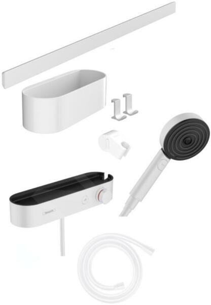 Hansgrohe WallStoris, zuhanyfej készlet 105, 3 fúvóka, termosztát és fürdőszobai kiegészítők, matt fehér 24250700 A zuhanycsomag tartalmaz kézi zuhany aktiválása anyaga: műanyag / fém, matt fehér a zuhany alsó része: grafitfekete zuhanyfej mérete: 105 mm XXL Teljesítmény zuhanysugár: PowderRain, IntenseRain, MonoRain kényelmes aktuális választás a Select gombbal maximál