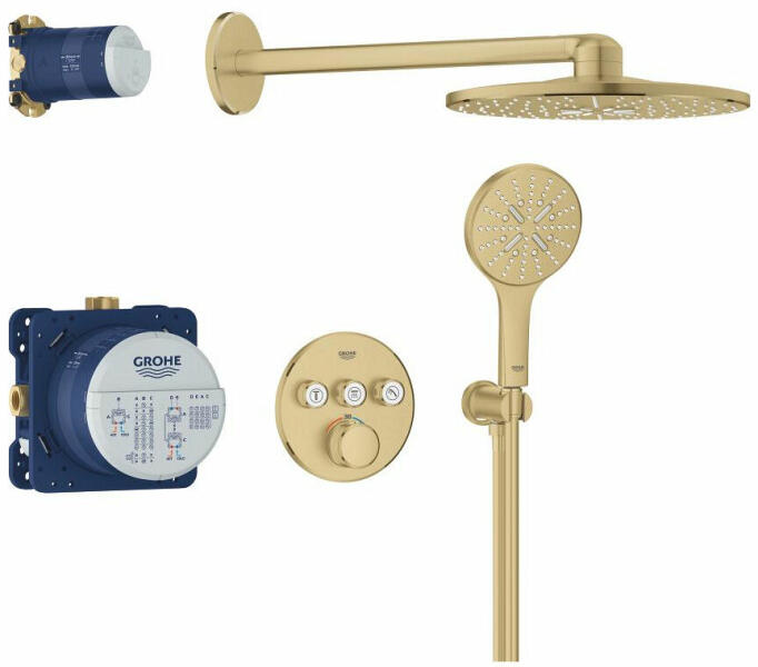 TERMÉKLEÍRÁS Szín: Brushed Cool Sunrise az alábbiakból áll: falsík mögötti termosztát, 3 fogyasztóra (29 121) GROHE Rapido SmartBox univerzális beépítő doboz, 1/2" (35 604) Rainshower SmartActive 310 head shower set 2 sprays (26 475) including horizontal shower arm 430 mm and head shower rough-in (26 483) Rainshower SmartActive 130 hand shower 3 sprays shower outlet elbow 1/2" with