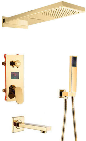 Akkumulátorkészlet zuhanyzóhoz/fürdőkádhoz, skandináv ihletésű modellek, fényes arany színű. _x000D_ _x000D_ Külső oldalról korrózióálló réteg borítja, amely biztosítja a hosszú távú használatot. _x000D_ _x000D_ Kiváló szűrés a több szűrőnek köszönhetően. _x000D_ A csaptelep a falra van szerelve. _x000D_ _x000D_ A csomag tartalma:_x000D_ _x000D_ /fürdőkád csa