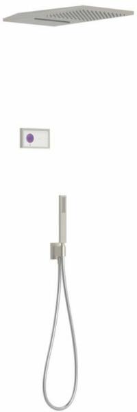 Fehér elektronikus vezérlő Falba építhető elektronikus 3 utas belső egység 280 x 550 mm-es rozsdamentes acél fejzuhany 2 fúvókával Vízkőmentesített kézi zuhannyal és fali tartóval Szatén zuhanytömlővel Acél színben