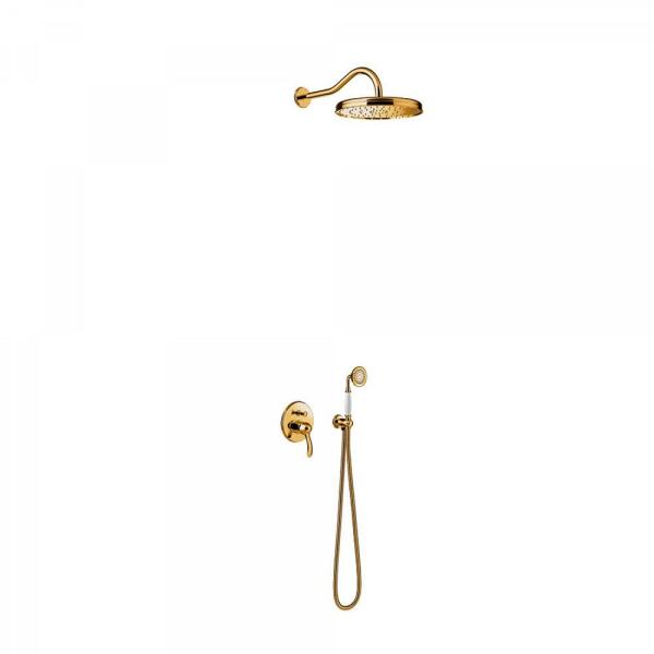 Falba építhető kivitel Tartalmazza a belső egységet Egykaros, 2 utas zuhanycsaptelep 310 mm-es gömbcsuklós fejzuhannyal 78 mm-es, vízkőmentesített kézi zuhannyal és fali tartóval Duplán reteszelt zuhanytömlővel Arany színben