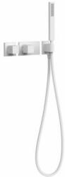 Falba építhető kivitel Tartalmazza a belső termosztátos egységet Átfolyáskorlátozóv al Vízkőmentesített kézi zuhannyal és fali tartóval Szatén zuhanytömlővel Matt fehér színben
