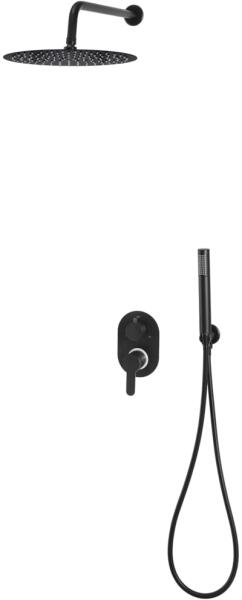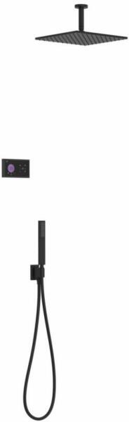 Fekete elektronikus vezérlőpanel Falba építhető elektronikus belső egységet tartalmazza 300 x 300 mm-es gömbcsuklós mennyezeti fejzuhannyal Vízkőmentesített kézi zuhannyal és fali tartóval Szatén zuhanytömlővel Matt fekete színben