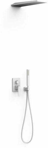 Falba építhető belső egységgel 2 utas, egykaros keverőcsaptelep Átfolyáskorl tozóval 160 x 550 mm-es fali rozsdamentes acél fejzuhany Vízkőmentes kézi zuhannyal és fali tartóval Szatén zuhanytömlővel Matt fehér színben